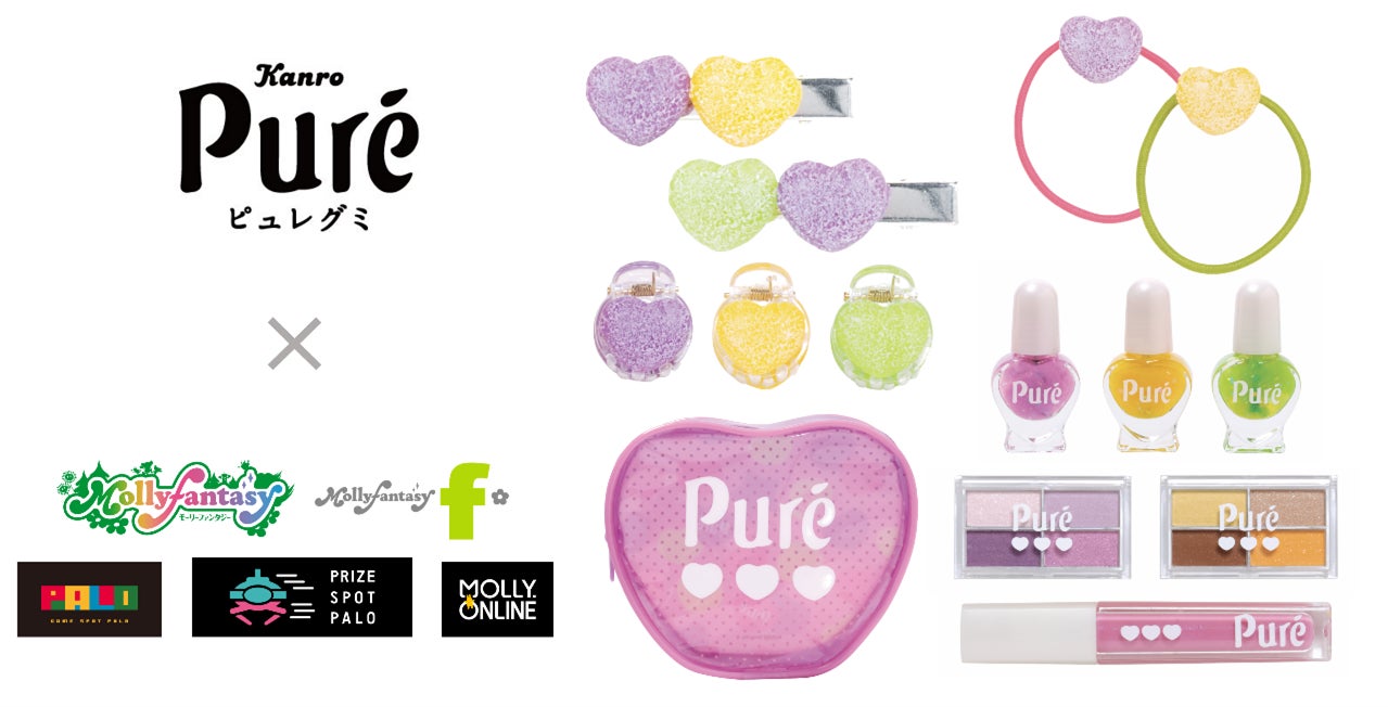 カンロ株式会社の大人気商品『ピュレグミ』がコスメアイテムになって登場。フルーツのおいしさを引き出す“すっぱいパウダー”と“果肉食感”により噛むほどにフルーティーなおいしさの『ピュレグミ』を再現した「ヘアクリップ」、「ヘアピン」、「ヘアゴム」、ハート型がかわいい「コスメポーチ」や、『ピュレグミ』のフルーティーなカラーをイメージした「リップグロス」、気分によって変えられる「はがせるネイル」、「アイシャドウ」、パステルカラーの「シュシュ」、「爪やすり」の9アイテム全25種を展開いたします。『爪やすり』にはモーリーオンライン限定デザインも登場いたします。