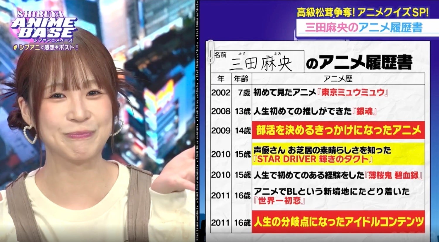 続いて、ゲストのアニメ遍歴を履歴書形式でお届けする『私のアニメ履歴書』のコーナーへ。今回は、三田真央さんの濃厚すぎるアニメ人生を振り返ります。