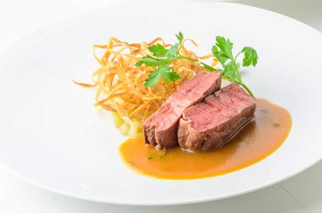 ・【シェアメニュー】北海道産牛フィレ肉のステーキ ナスのフォンダン、十勝産牛蒡簿フリット