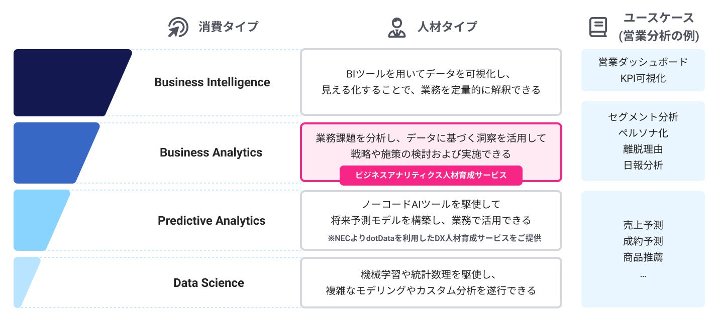 NECはこれまでに、dotDataのAIを活用し、現場担当者をデータ活用人材に育て上げる「DX人材育成サービス」を提供し、1,000人以上の参加実績があります。今回発表の「dotData ビジネスアナリティクス人材育成サービス」と既存の「DX人材育成サービス」により、データ分析の基礎から実業務のデータを用いた実践的なスキルを習得できます。これにより、お客様のDX推進・変革を強力に支援します。