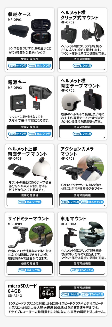 バイク用・自転車用・自動車用、更にGoproアクセサリーに対応できるマウントが何種類を開発され、いろんなシーンにで使用可能。