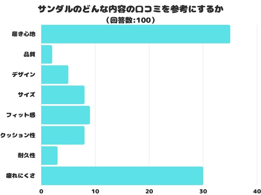 サンダルのどんな内容の口コミを参考にするかをアンケートにて調査したところ、1位は「履き心地」でした。