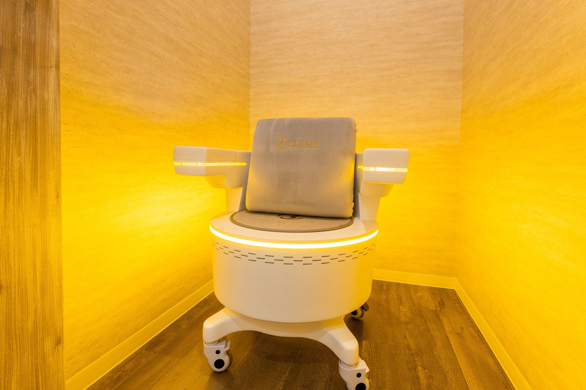 服を着たまま座るだけで「筋肉+脂肪」両方にアプローチできます。なかなか鍛えることのできない骨盤底筋や下半身を電磁パルスの刺激で座るだけで鍛えることができる美容マシンです。