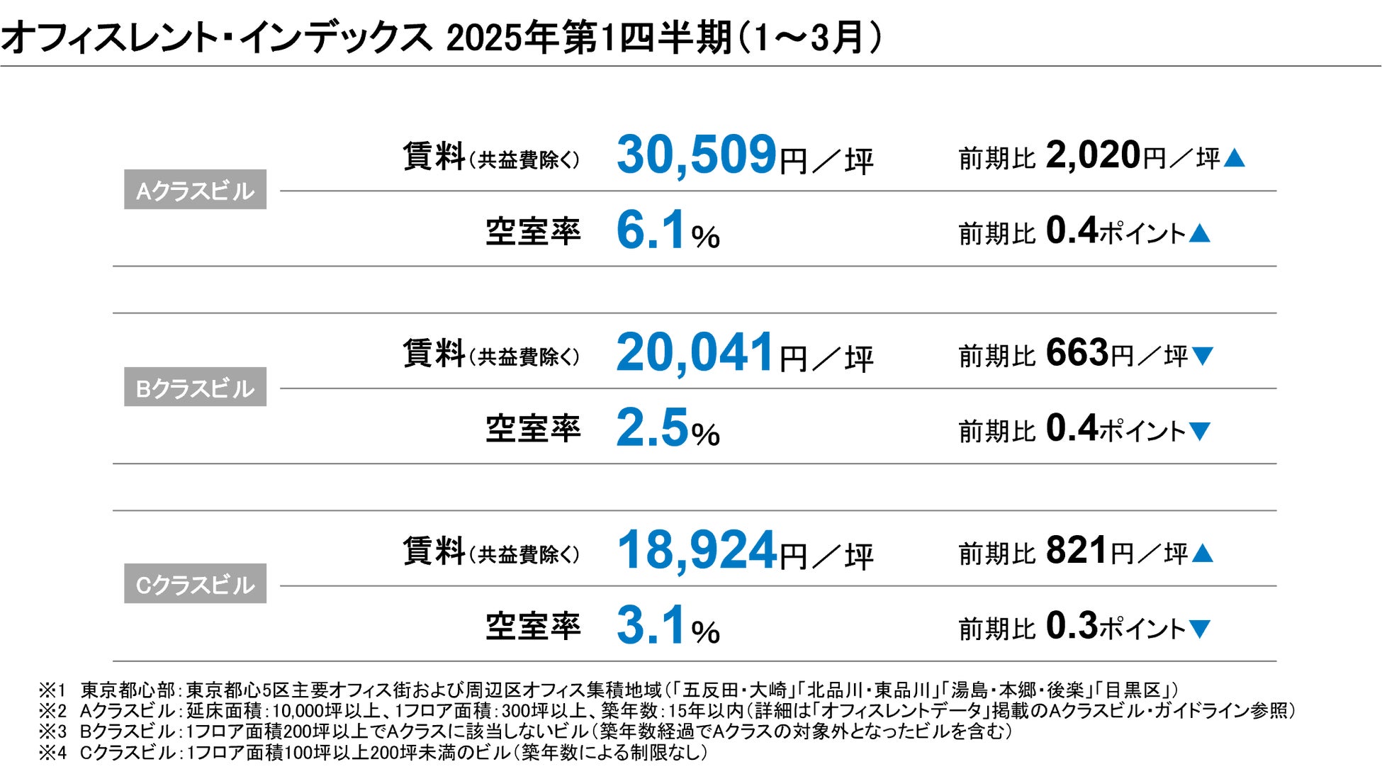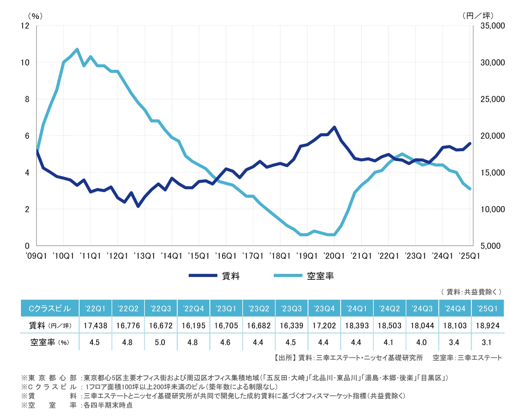 東京都心部 A・B・Cクラスビルの成約ベース賃料、空室率を発表