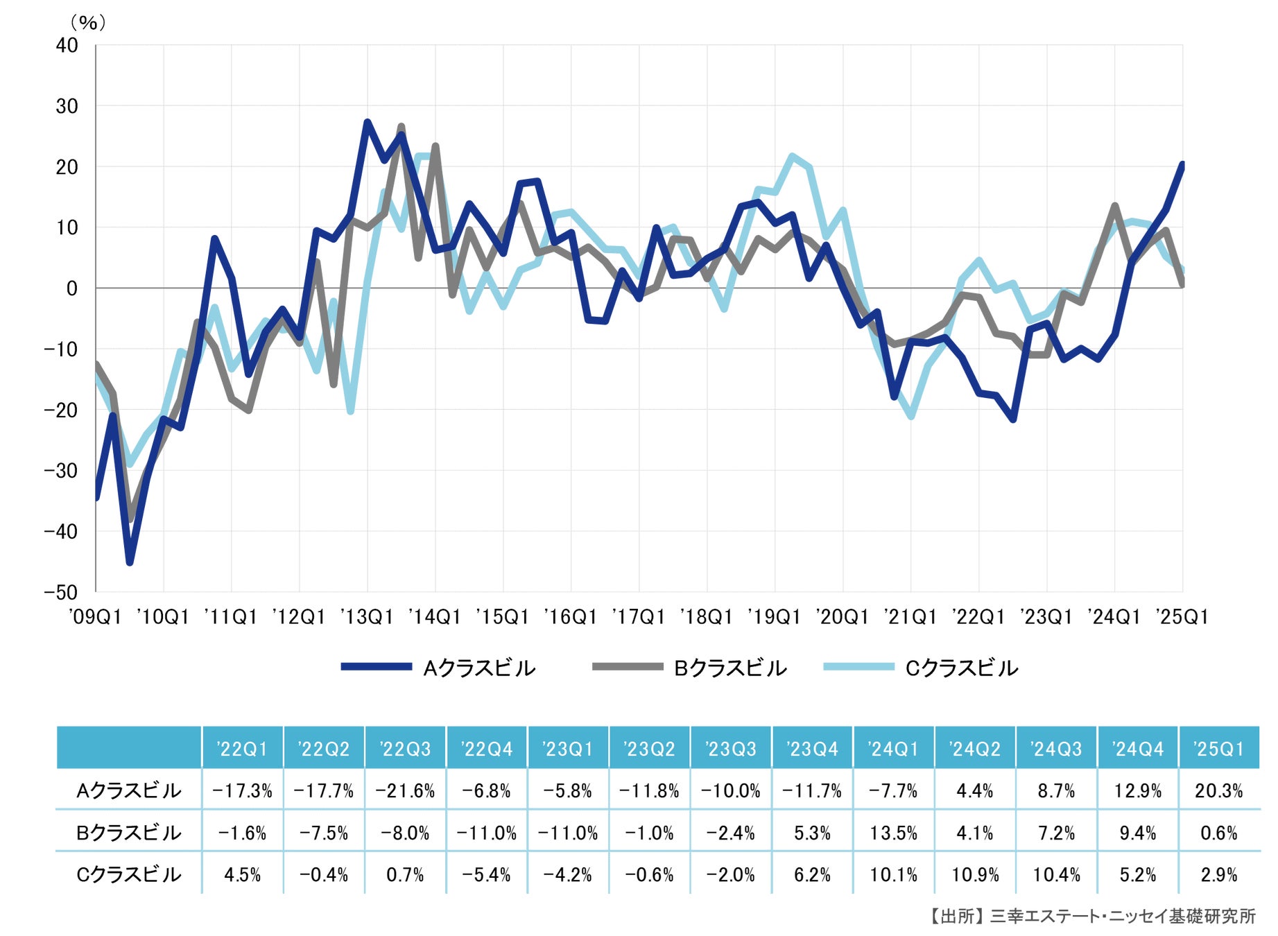 2024年第1四半期との比較による対前年変動率は、Aクラスビルがプラス20.3%、Bクラスビルがプラス0.6%、Cクラスビルがプラス2.9%だった。Aクラスビルは4期連続、BクラスビルおよびCクラスビルは変動幅が縮小しているものの6期連続のプラスとなっている。