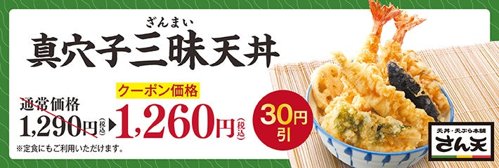 さらに「天丼・天ぷら本舗 さん天」公式アプリでは、フェア商品でお使いいただける30円引きクーポンを配信いたします。ぜひ、お得にご利用ください。