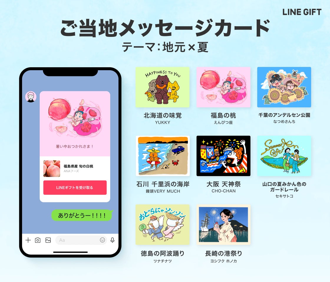 「LINEギフト」では、ギフトを贈るシーンに合わせた全360種類以上のメッセージカードの中から、好きなカードをギフトに添えて贈ることで、感謝やお祝いの気持ちを相手に届けることができます。今回、ご当地ギフトと一緒に贈れる8種の「ご当地メッセージカード」が夏季限定で登場しました。8人の人気クリエイターが、自身の“地元“と“夏”をテーマに描き下ろしており、日本各地の夏の風物詩が描かれています。