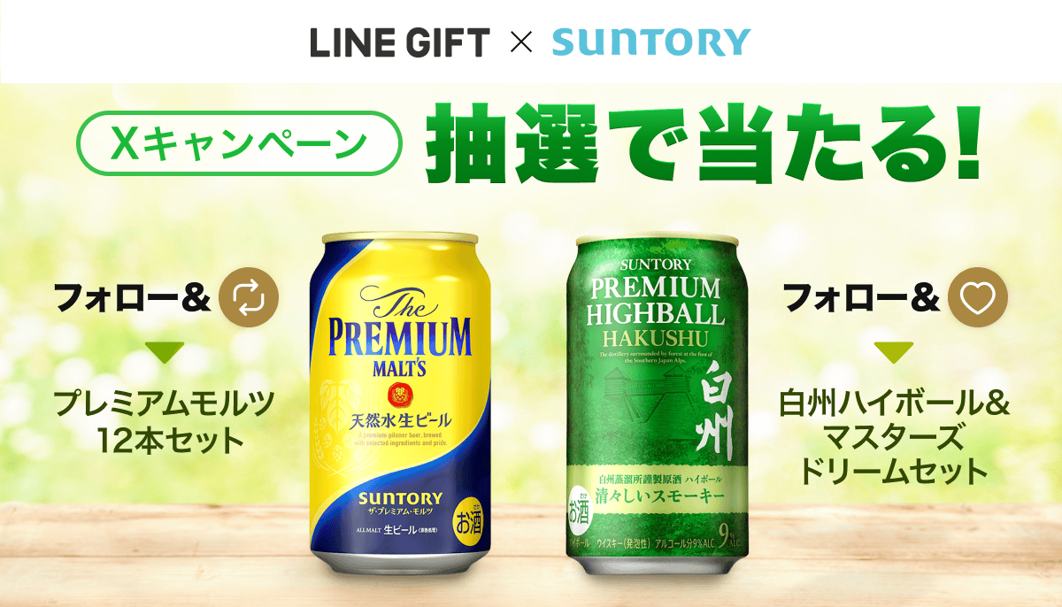 「LINEギフト」の公式Xアカウント( https://x.com/LINEGIFT_JP )をフォローし、キャンペーンポストを“リポスト”か“いいね”すると応募完了です。サマーギフトにぴったりな「プレミアムモルツ」の12本セットか、「白州ハイボール缶」とプレミアムモルツの最高峰「マスターズドリーム」の詰め合わせセットを、「LINEギフト」からのお中元として抽選で贈答します。