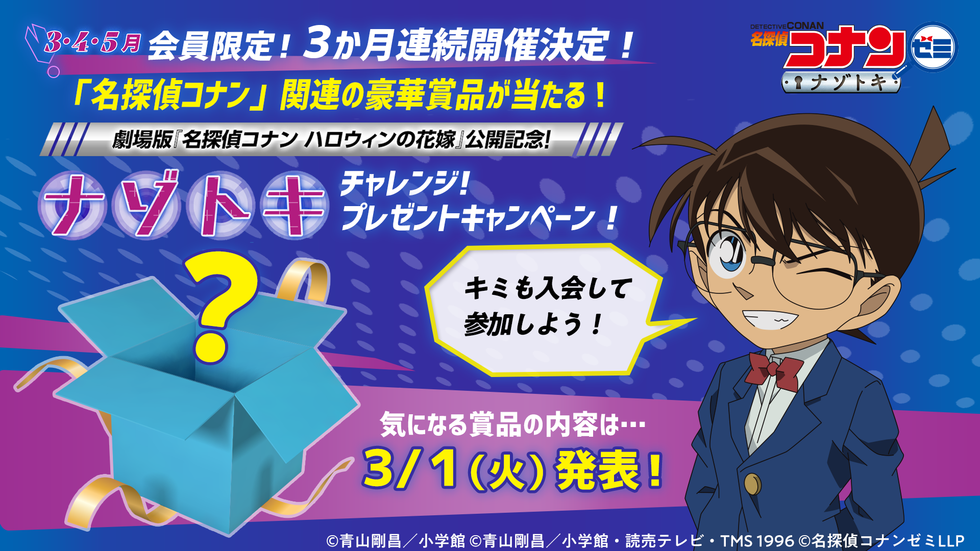 2022年4月15日(金)公開予定の劇場版「名探偵コナン ハロウィンの花嫁」公開に先立ちまして、豪華プレゼントが抽選で当たる「ナゾトキチャレンジ!プレゼントキャンペーン」を3月から3か月連続で開催いたします。 本キャンペーンは既存の会員様だけではなく、新しくご入会された方もご応募いただけます。