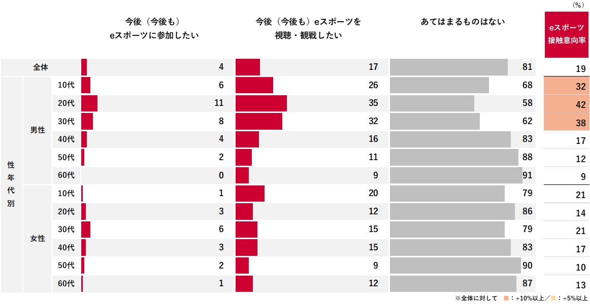 今後の接触意向について「参加」が4%、「視聴・観戦」が17%だった。「あてはまるものはない(81%)」を除いた接触意向率は19%となっており、これまでに接触経験があると回答した16%(接触率)から、3ポイントの増加に留まった。