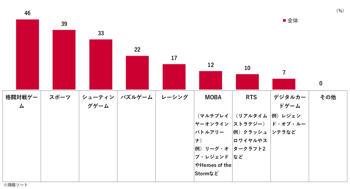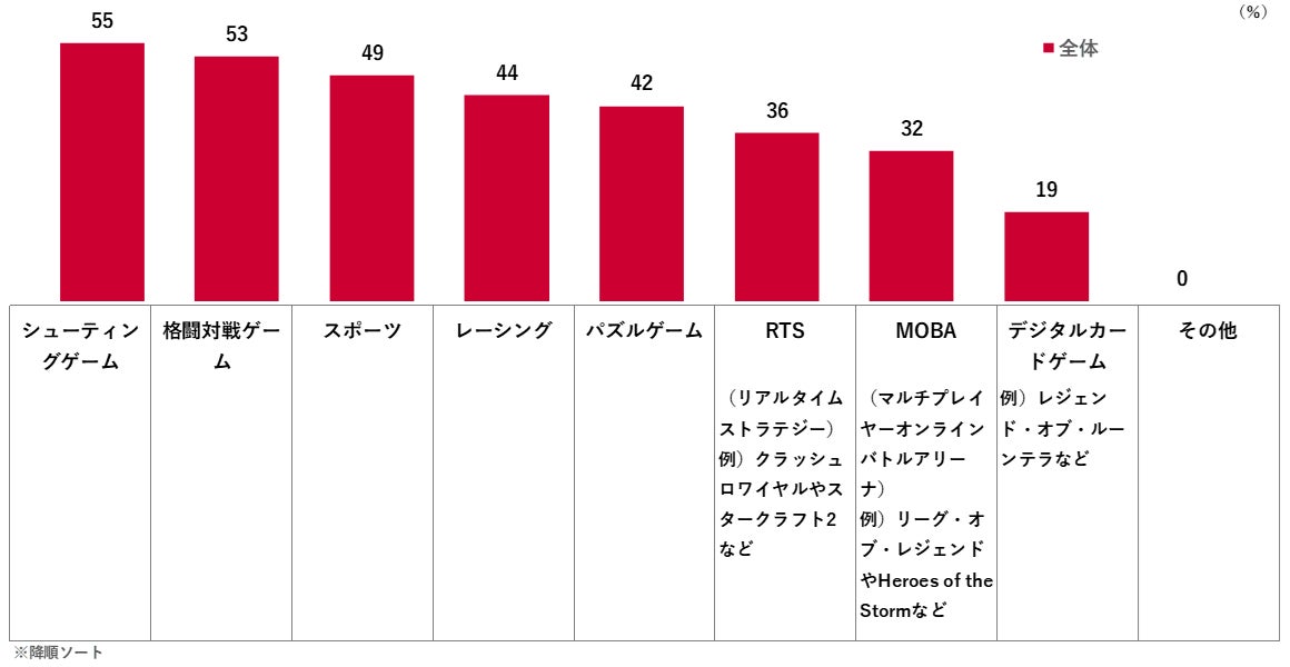 参加経験のあるジャンルは「シューティングゲーム(55%)」が最も高く、次いで「格闘対戦ゲーム(53%)」、「スポーツ(49%)」となった。視聴・観戦経験のあるジャンルも上位3つは「格闘対戦ゲーム(46%)」、「スポーツ(39%)」、「シューティングゲーム(33%)」と、参加ジャンルと同様の結果となった。