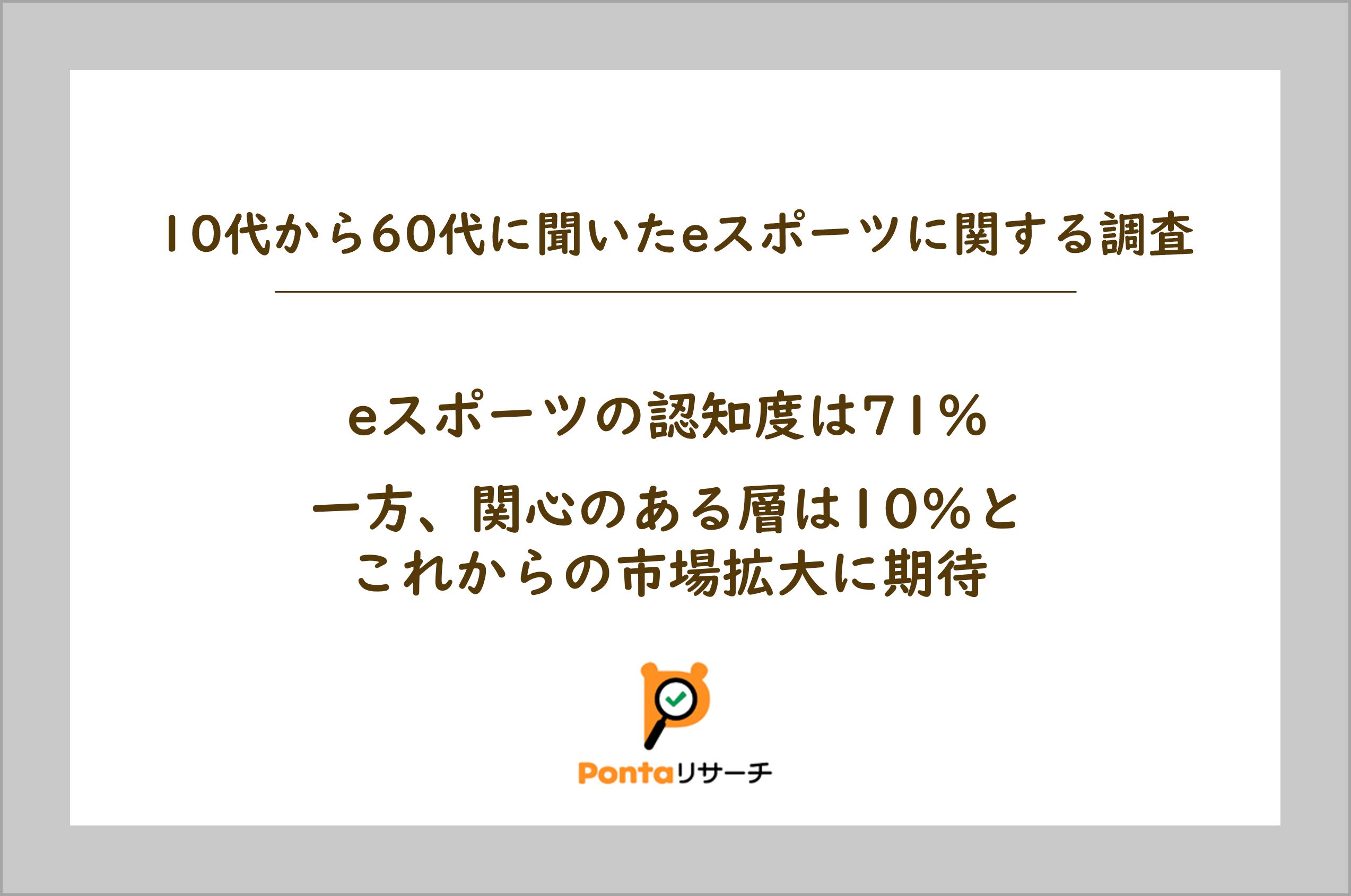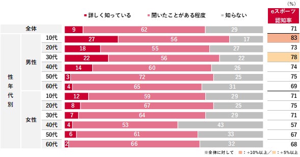 10代から60代に聞いたeスポーツに関する調査 eスポーツの認知度は71%。一方、関心のある層は10%とこれからの市場拡大に期待