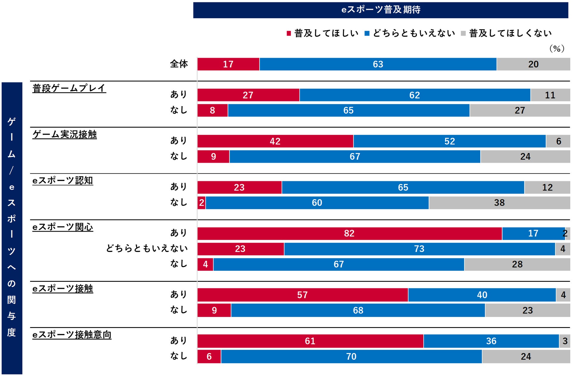 eスポーツの普及期待は「普及してほしい」が17%、「してほしくない」が20%と均衡状況