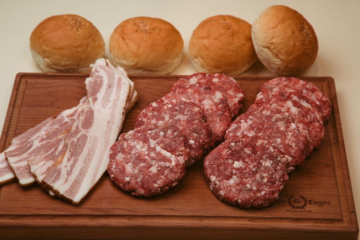 大小2つのハンバーガーセットには、バーガーパテとベーコン、バンズを詰め合わせています。バーガーパテは、熟成肉とフレッシュなチャックアイロールを使用した100%ビーフのオリジナルパテです。ベーコンは、約5㎜の厚さがあり、ベーコンのうま味をじっくり味わえる一品です。