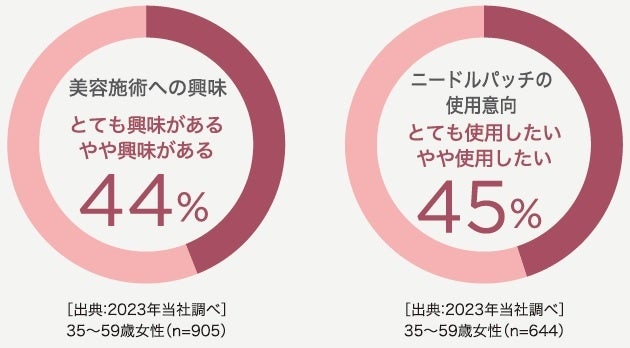 当社の調査(2023年)によると、35~59歳の女性の約40%の方が「シワ」や「ゆるみ」、「乾燥肌やせ」等をケアするために、ヒアルロン酸注射やダーマペンなどの美容施術への興味が高いことが分かりました。一方で、興味はあるが敷居が高く、まずは自分でできることから試せるスキンケアアイテムが欲しいという意向が強く、約半数の方がニードルパッチへの使用意向があることも分かりました。