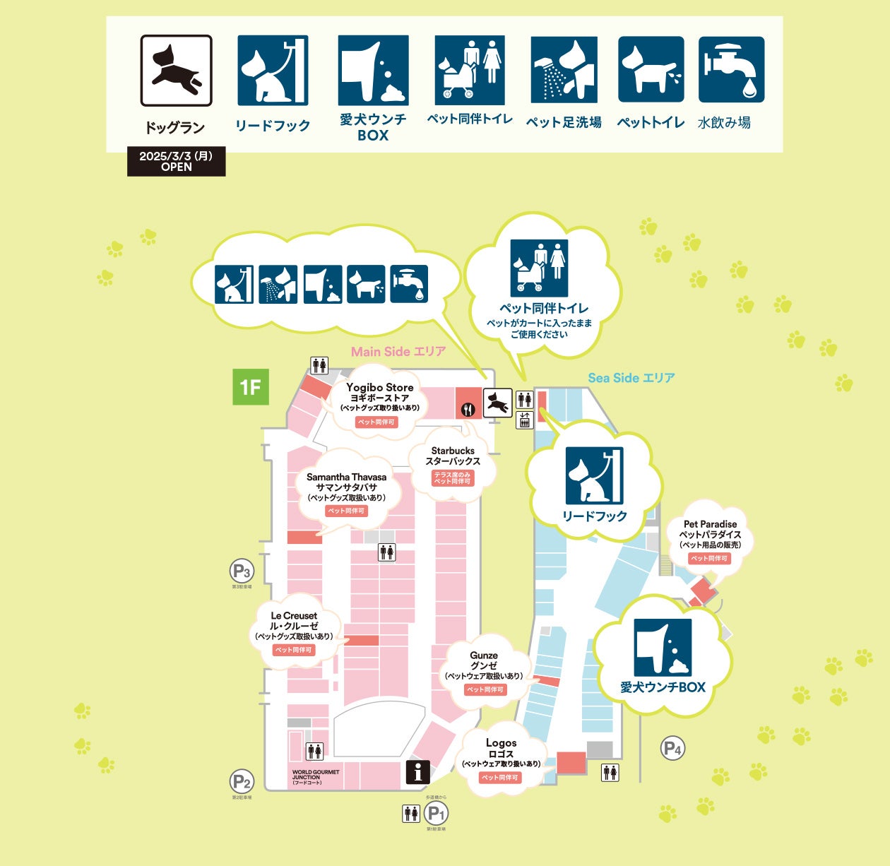 ペットと一緒に楽しく快適にショッピングいただけるよう、施設での過ごし方やペットグッズ取り扱いショップについて、各種設備とあわせてWEBサイトでご案内していますので、ぜひご覧ください。
