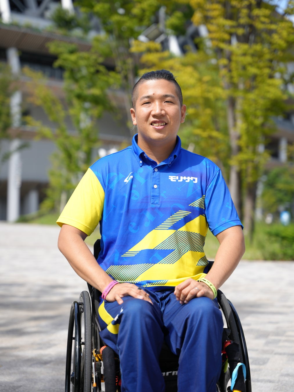 21歳の時に脊髄炎を発症。ロンドンパラリンピックを観たことがきっかけとなり車いす陸上競技に挑戦。2021年よりプロ転向し、モリサワの所属選手となる。奇抜なサムライヘアとカラーは、自身の好きな色であることと、所属先のモリサワブルーを印象づけたいという思いから。