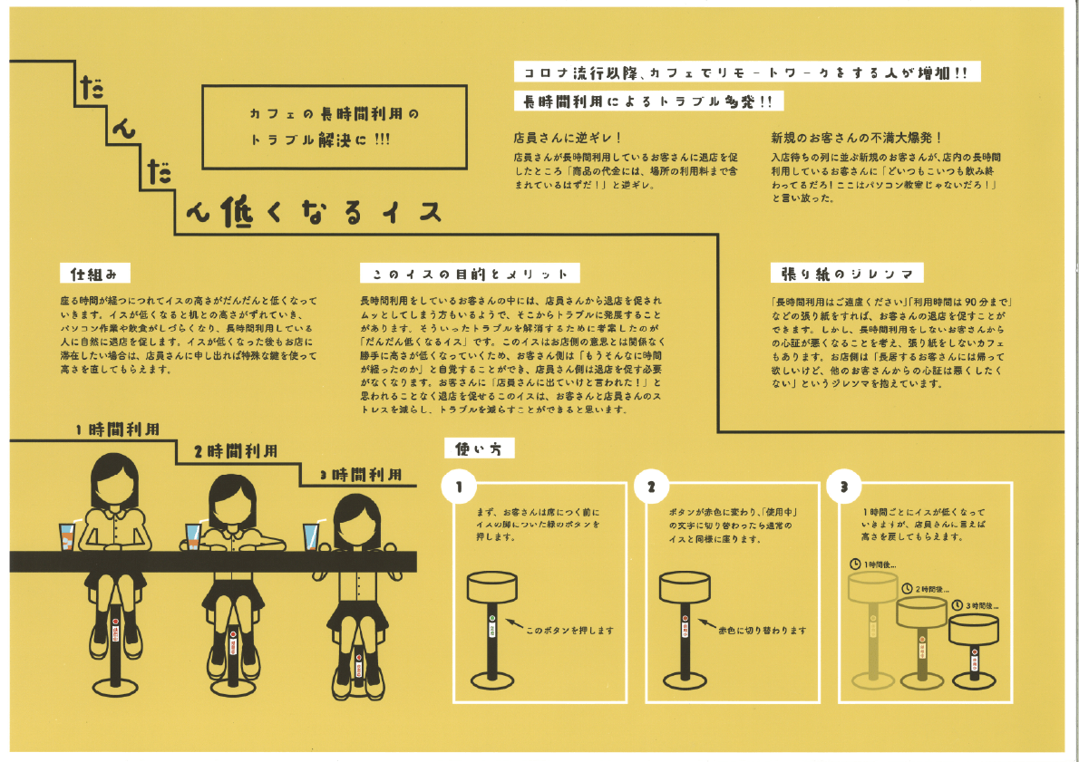 「長時間座るとだんだん低くなる椅子」カフェの長時間利用のトラブル解決に!