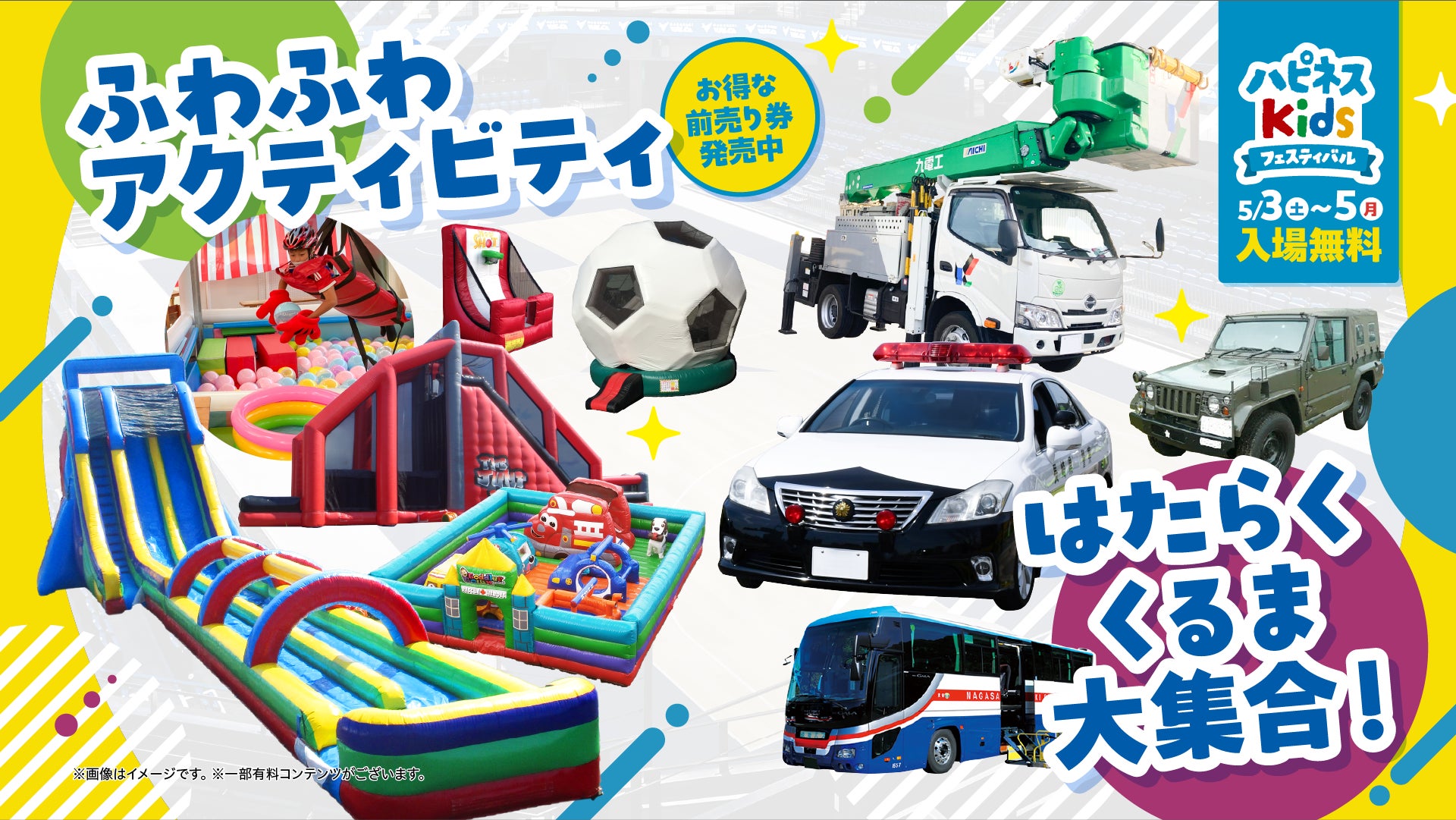 2)ふわふわ遊具&憧れのあの車が登場! 小さなお子様から楽しめるアクティビティも充実!