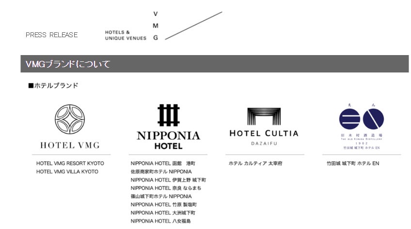 VMGは、2018年に「篠山城下町ホテル NIPPONIA」の運営を開始して以来、2024年までに日本全国11箇所で分散型ホテルを展開してきました。この分野のパイオニアとして、地域の歴史と文化を再発見し、それを特別な体験としてお客様にお届けします。VMGの分散型ホテルでは、まちに点在する歴史的建造物を利活用し客室として蘇らせるとともに、まちの名店や美しい庭園、商店などを巡ることで、まるでその地域が栄えた時代にタイムスリップして暮らしているかのような特別な滞在を演出します。各建物を、建築当時の在り姿をできるかぎり忠実に修復し、歴史の本質を尊重しながら現代の洗練されたライフスタイルにも馴染む文化体験をデザインしています。