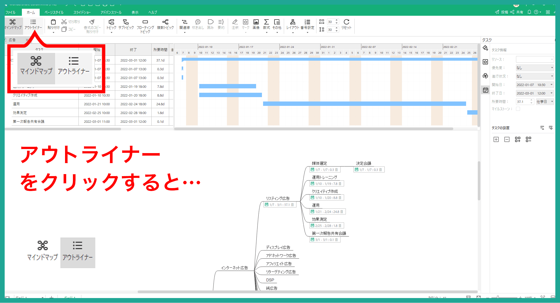 書き出した会議内容はワンクリックでガントチャート化する事が出来ます。
