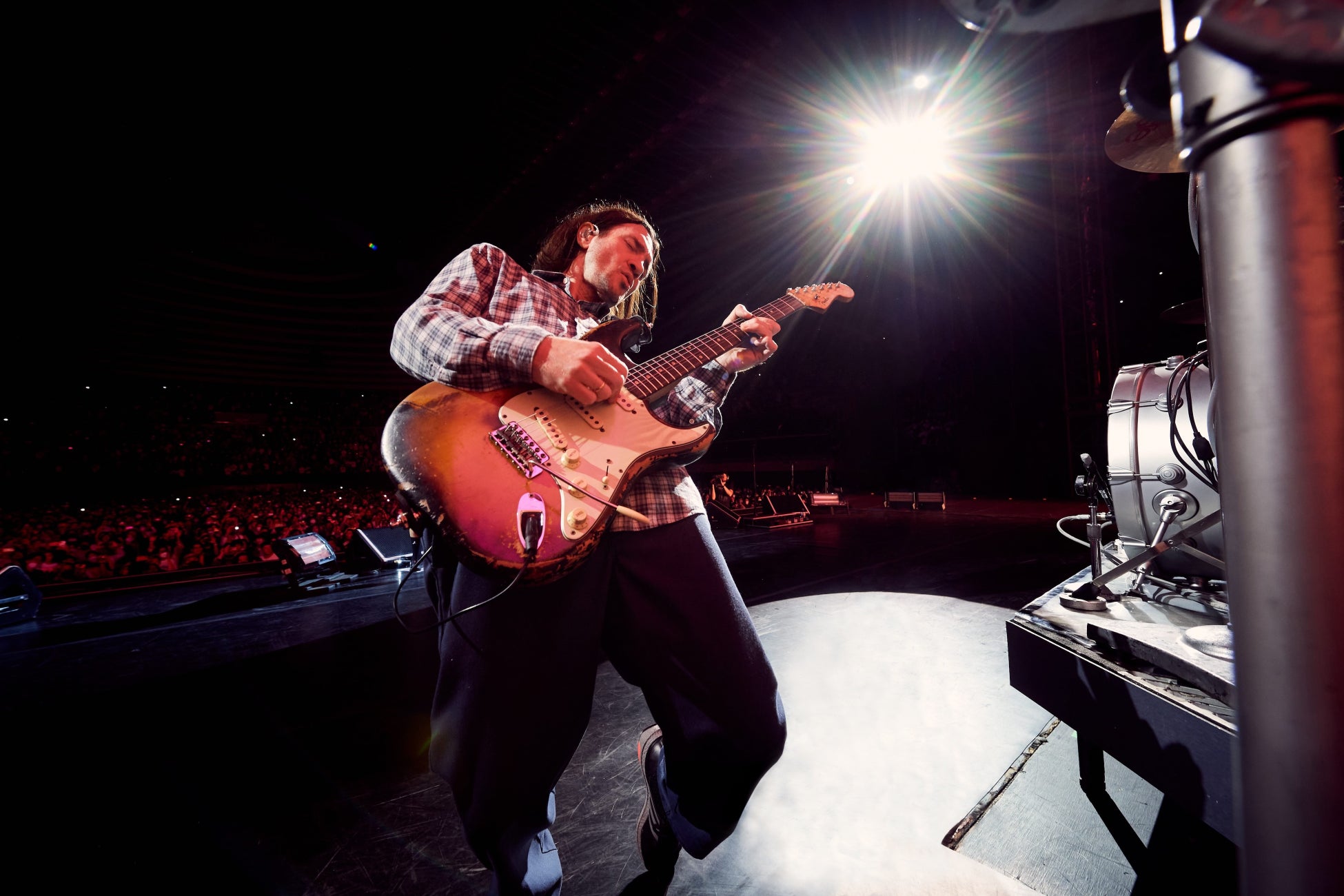 ジョンは数多くのFenderギターを巧みに操ることで知られていますが、その中でも特に1962年製サンバーストのストラトキャスターは象徴的な一本として広く認知されています。彼の演奏スタイルは、卓越したテクニックと激情のロック、複雑なファンクリズムの融合から成り、ストラトキャスターの独特なサウンドは彼の音楽性をさらに引き立てています。多くのギタリストがブリッジやネックピックアップだけに頼りがちになる中、ジョンは5通りのピックアップ組み合わせを駆使してストラトキャスターのポテンシャルを最大限に引き出し、ブリッジピックアップの歯切れの良いミッドレンジと力強い出力でソロにインパクトを持たせています。そして、スイッチ操作で彼のトーンは一瞬の途切れもなく鮮明に切り替わり、ネックピックアップからは丸みのある豊かなリズムサウンドが生み出されます。
