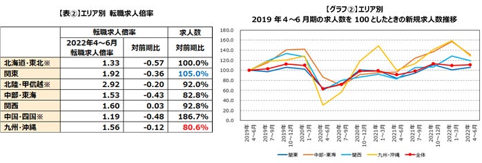 新規求人数も引き続き好調に推移。2021年4~6月期の新規求人数は、コロナ流行前の2019年4~6月期と比較し110.7%で、本データを取得し始めた2019年4~6月期以降、過去最高の水準まで回復しています(グラフ①参照)。また、前年同期比は121.9%でした。