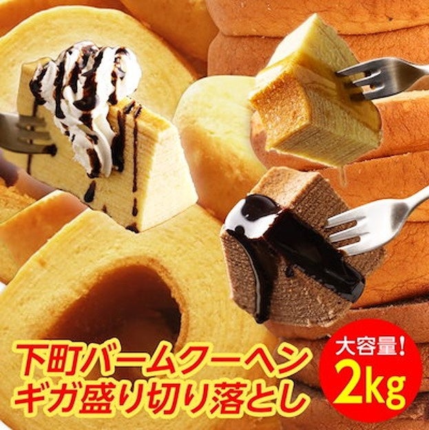 切り落としの部分をギガ盛として2キロも詰め込んだ商品。バニラ、メープル、紅茶、ココア、はちみつ味など全28種類から4種がランダムで入っている夢のようなセット!