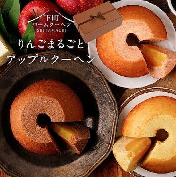 みずみずしい「ふじりんご」まるごと1個をバームクーヘンで包んだアップルクーヘン。プレーン、ショコラ、ストローベリーから選べるセット。贈答品としても重宝!