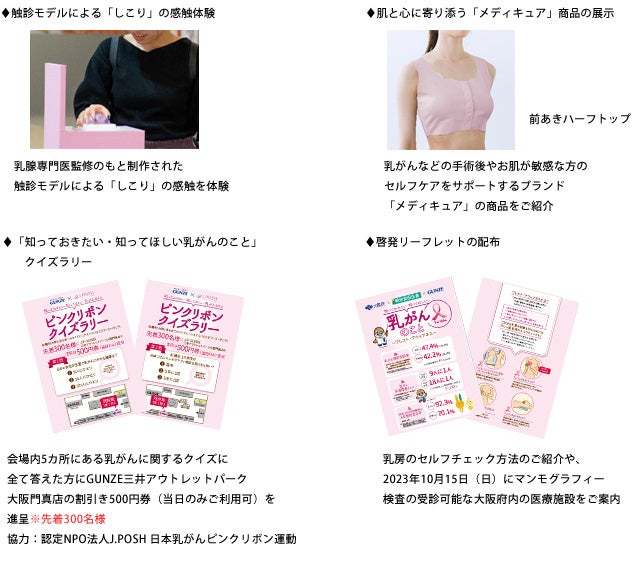 グンゼは、乳がん触診モデルによる「しこり」の感触体験、乳がんなど手術後の患者さまのセルフケアをサポートする 肌着ブランド「メディキュア」のご紹介、乳がんに関するクイズに答えるクイズラリー、大阪府と明治安田生命保険相互会社とともに作成した啓発リーフレットを配布します。イベントへの参加を通じて、乳がんの正しい理解の促進と、乳がん検診の重要性・必要性をアピールし、乳がん検診の受診につなげます。