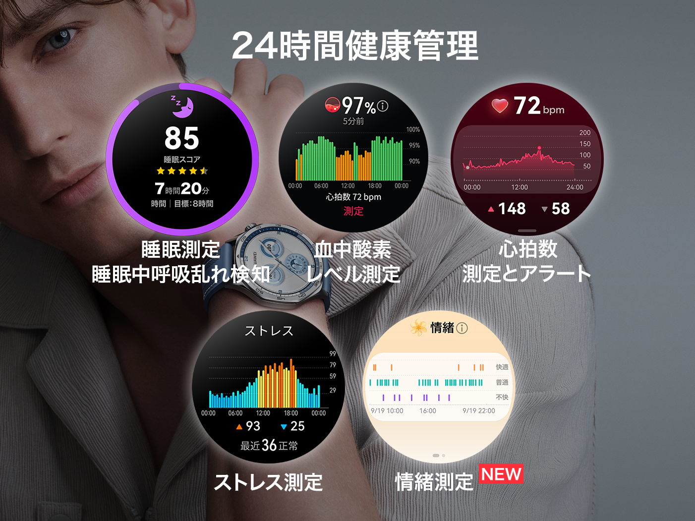 GT 5シリーズより、これまで個々であった健康管理モニタリング技術を、多次元センシングシステムに統合した「HUAWEI TruSenseシステム」を新たに搭載します。より正確で包括的なヘルストラッキングをお届けできるようになりました。スマートウォッチの健康管理における、新たなブレイクスルーとして、これまでの生理学的指標だけでなく、「情緒測定」も可能となりました。