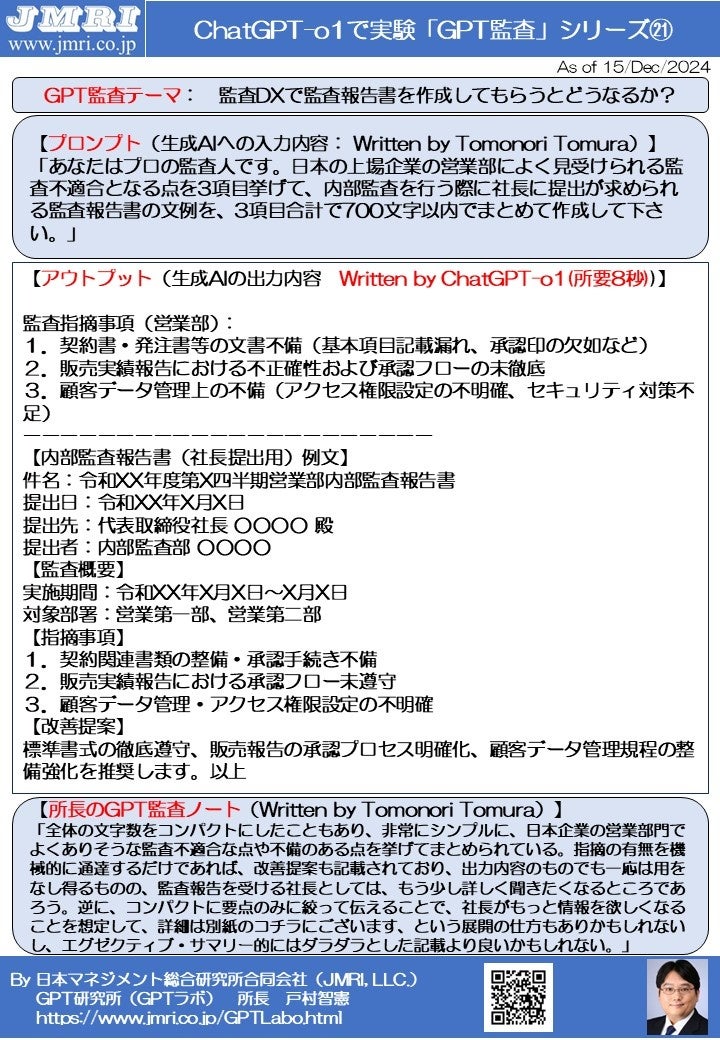 ChatGPT「o1」で監査DX: 生成AIに監査報告書のたたき台を作成させみたGPT監査レポート第22号(GPT研究所 所長・弊社理事長 戸村智憲)を公開【日本マネジメント総合研究所合同会社】