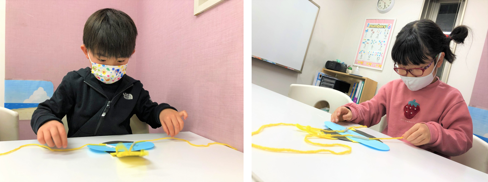 「色」「形」に関する単語や工作につかうフレーズを繰り返し口にしながら、クラフトを完成
