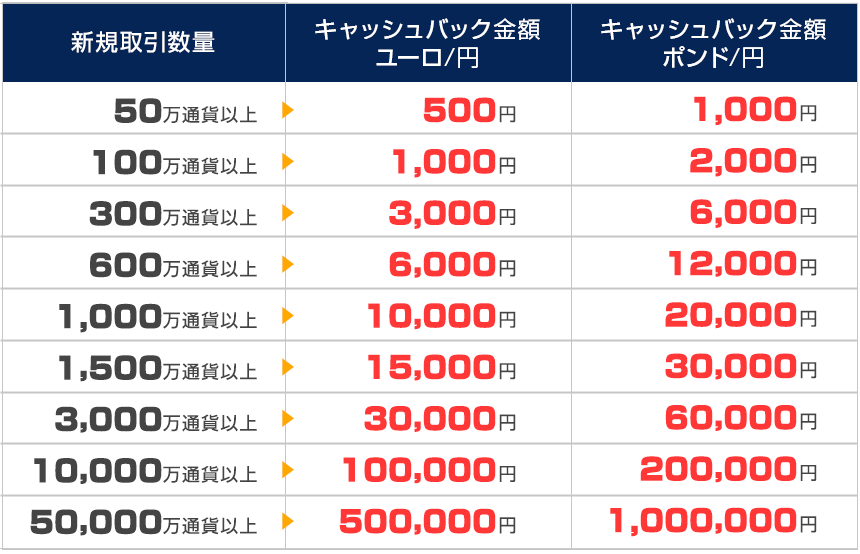 本キャンペーンにお申し込みいただいたお客様を対象に、『選べる外貨』でのユーロ/円・ポンド/円それぞれのお取引における期間中の新規取引数量に応じてキャッシュバックします。
