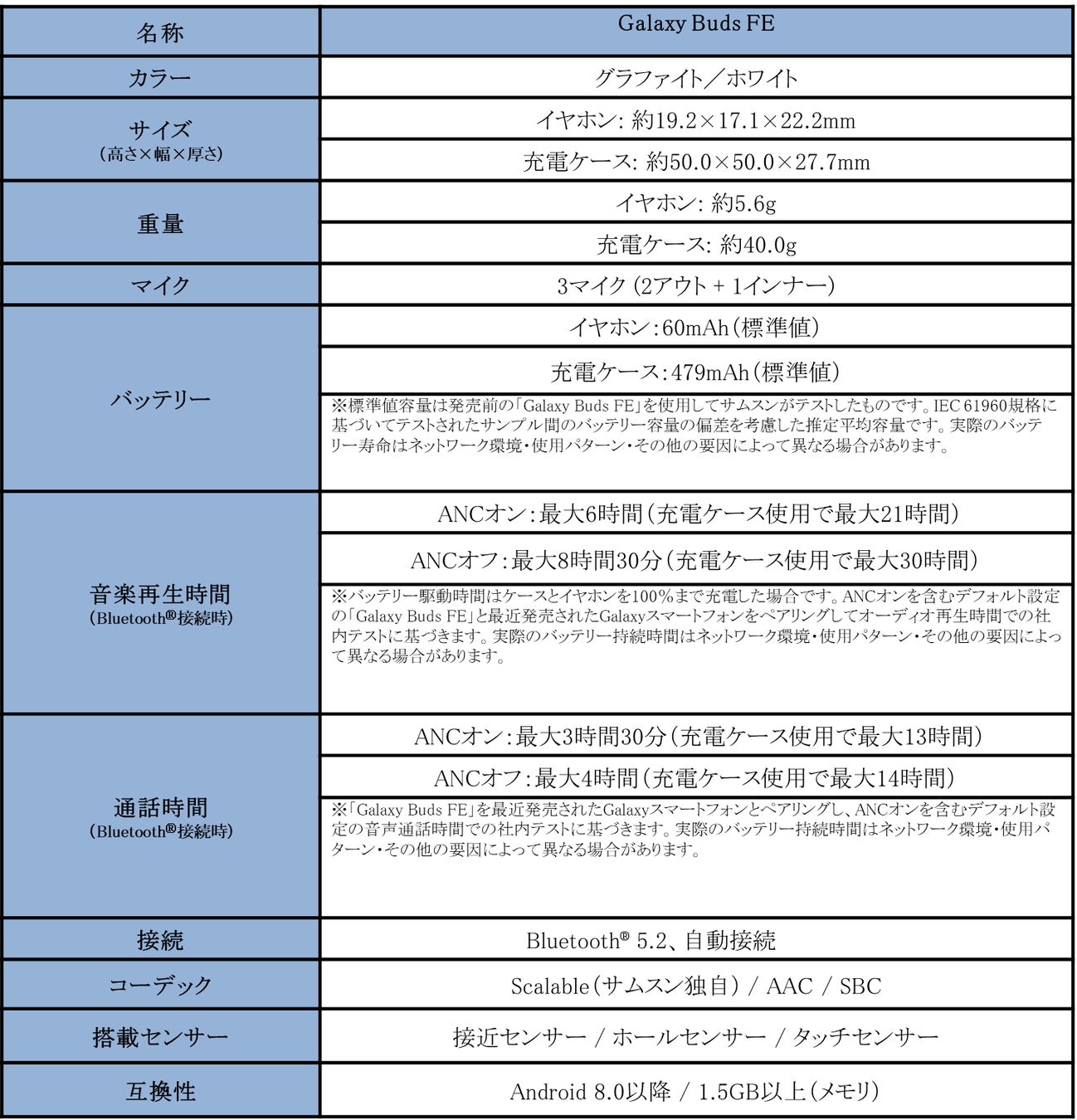 「Galaxy Buds FE」はANC未使用時に最大8.5時間、充電ケースの使用を含めると最大30時間の音楽再生が可能になり、利便性が向上いたしました。また、ANC使用時には最大6時間、充電ケースの使用を含めると最大21時間の音楽再生が可能です。