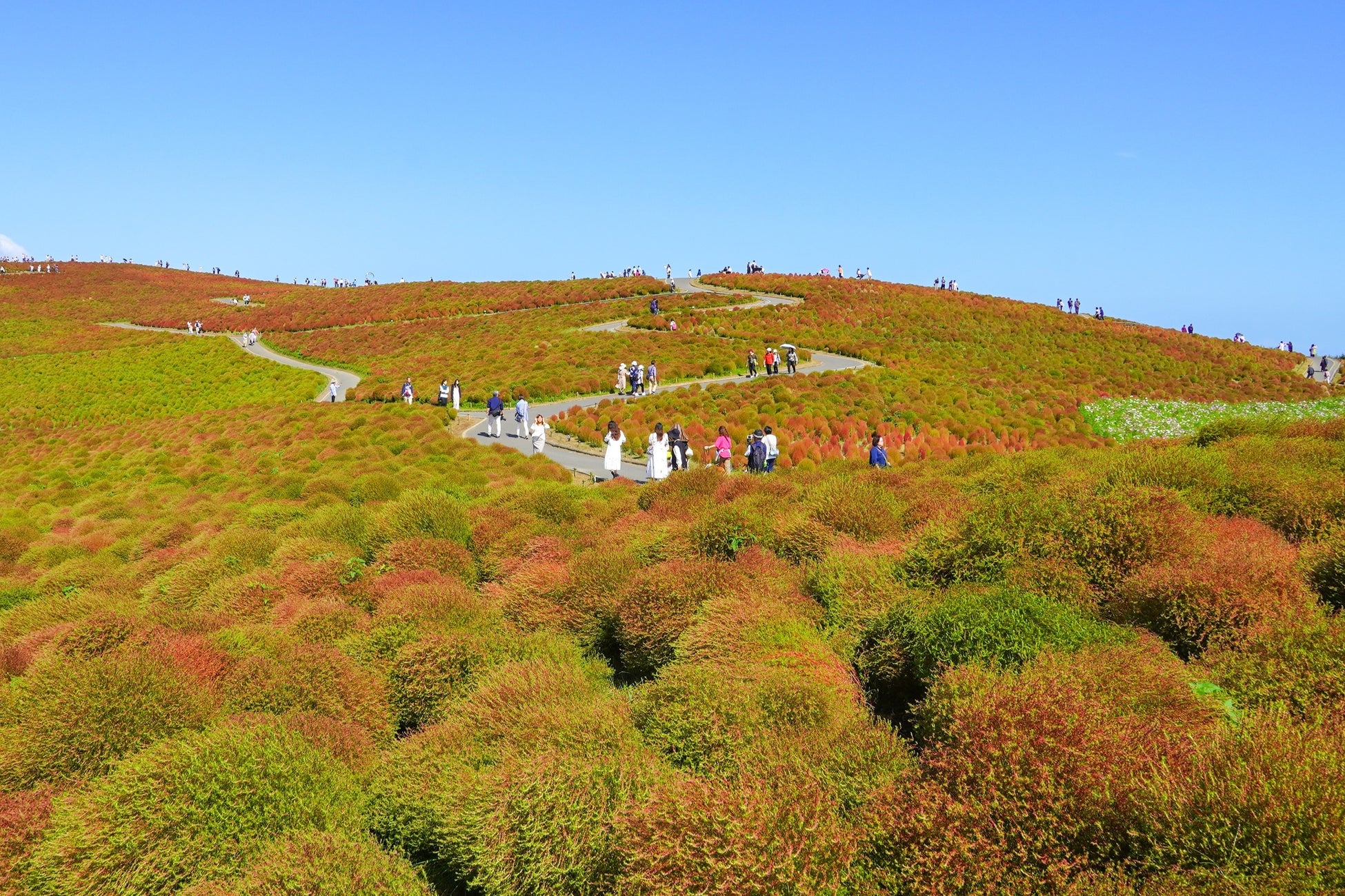 国営ひたち海浜公園の「みはらしの丘」では、約4万本のコキアが所々で赤く色づき始めました。丘全体では10月5日から色づき始め、10日頃に「紅葉始め」、17日頃に「紅葉見頃」を迎える見込みです。丘一面が赤く染まるまでは、緑と赤の色鮮やかなグラデーション。秋の深まりと共に緑色から徐々に赤く色づく様子は、まるで衣装替えをしているようで、日々変わりゆく絶景をお楽しみいただけます。