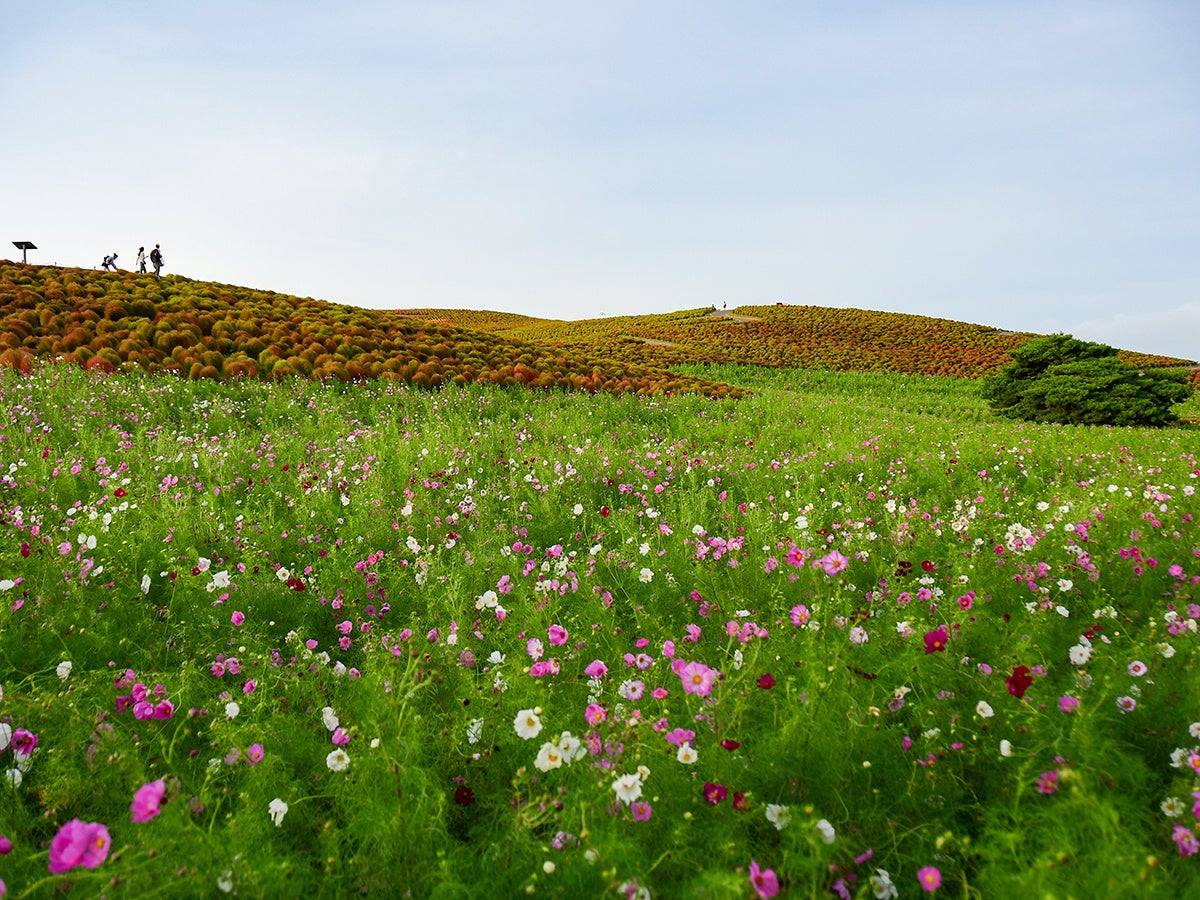 みはらしの丘のふもとから中腹では現在、約236万本のコスモスが咲き始め、14日から見頃(7分咲き)を迎えると予想しています。丘のふもとを華やかに彩る“赤・白・ピンク”のコスモスと、丘一面を紅葉で赤く染めるコキアによる、秋の共演をお楽しみください。