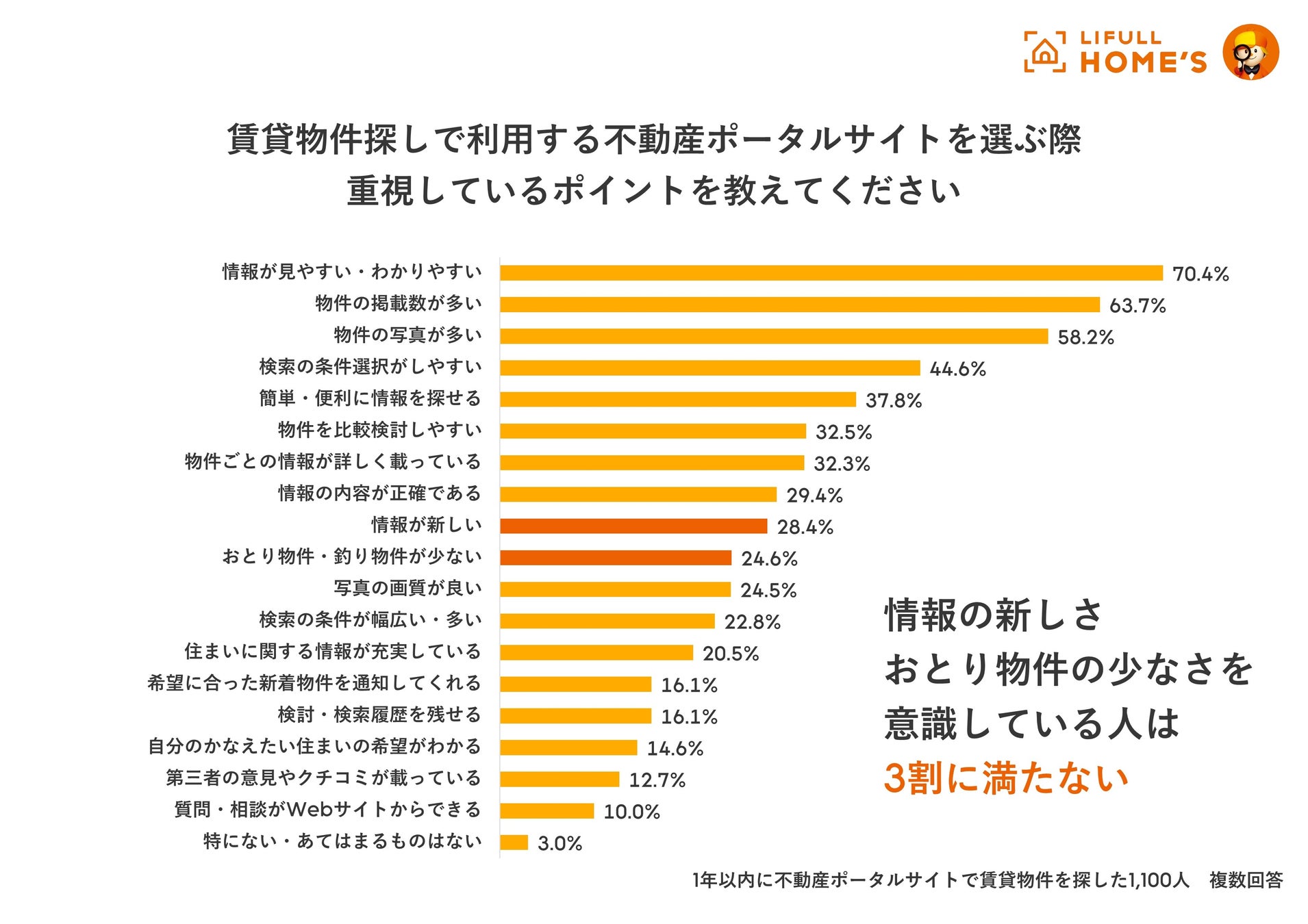 こうした定義を説明したうえで、「おとり物件」という言葉について知っているか聞いた質問では、25.1%が「聞いたことがない」、14.0%が「意味は知らなかったが聞いたことはある」と回答しており、39.1%の人がおとり物件に対する理解が浅いことがわかります。そうした背景もあるのか、不動産ポータルサイトを選ぶ際に重視しているポイントで、「情報の新しさ」「おとり物件の少なさ」を選ぶ人は3割にも満たない結果となりました。
