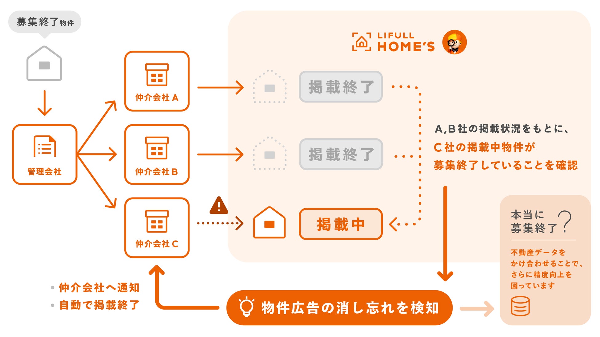 連携している不動産管理会社の物件情報とLIFULL HOME'Sに掲載されている物件情報を毎日照合し、募集終了している物件を非掲載にします。この機能は業界初の取り組みで、特許を取得しています。