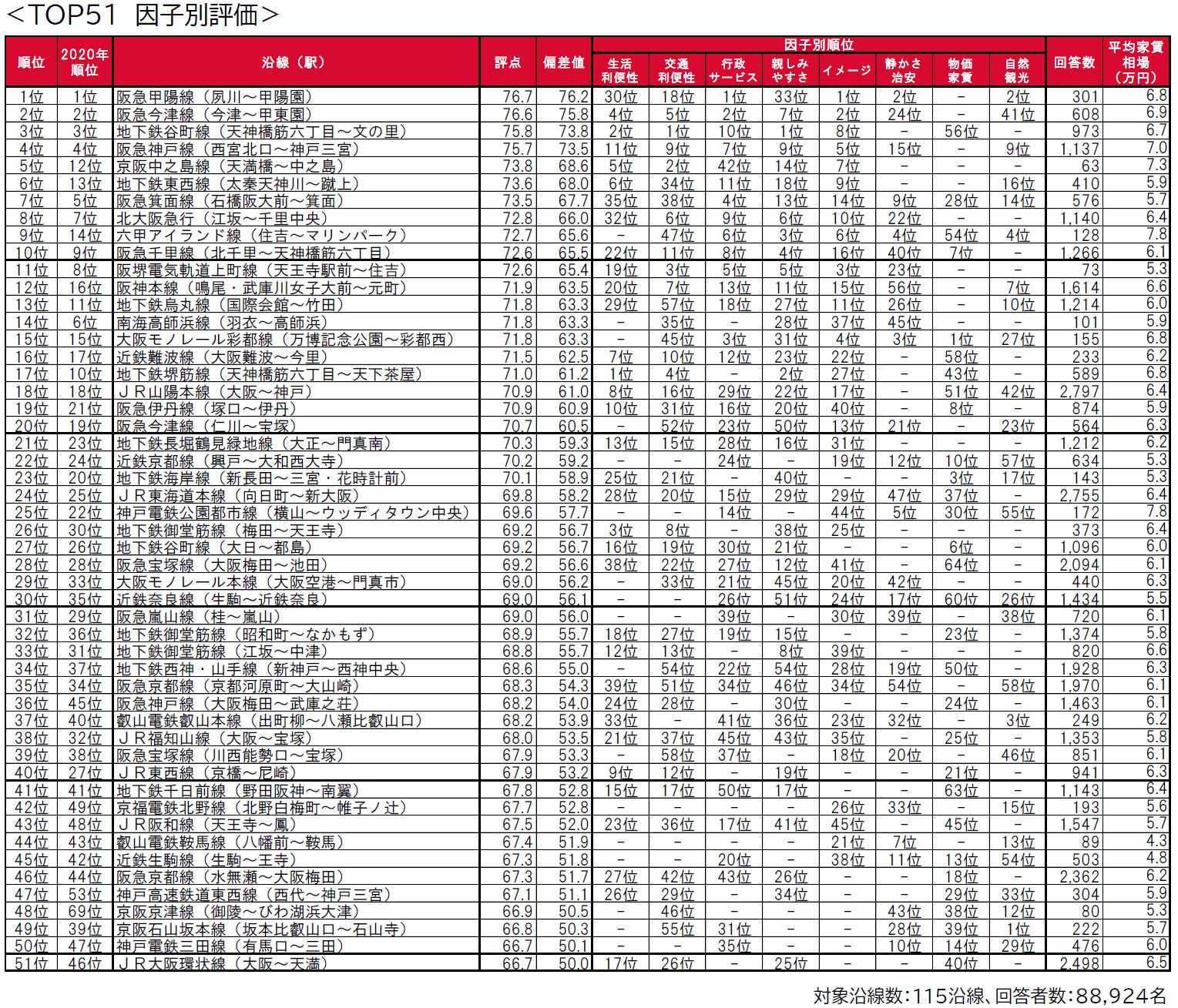 - 街の住みここち沿線ランキング2021<関西版> TOP51の因子別評価