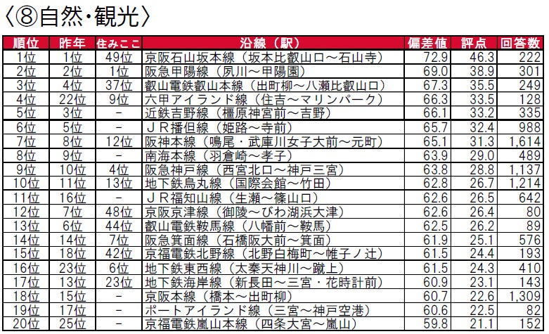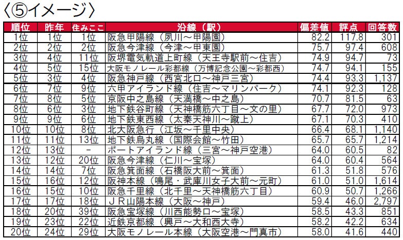 TOP4までの順位は昨年と変わらず、1位は阪急甲陽線(夙川~甲陽園)、2位は阪急今津線(今津~甲東園)、3位は地下鉄谷町線(天神橋筋六丁目~文の里)、4位は阪急神戸線(西宮北口~神戸三宮)です。TOP10内では、5位に京阪中之島線(天満橋~中之島)(昨年12位)、6位に地下鉄東西線(太秦天神川~蹴上)(昨年13位)、9位に六甲アイランド線(住吉~マリンパーク)(昨年14位)が、それぞれ昨年からランクアップしています。