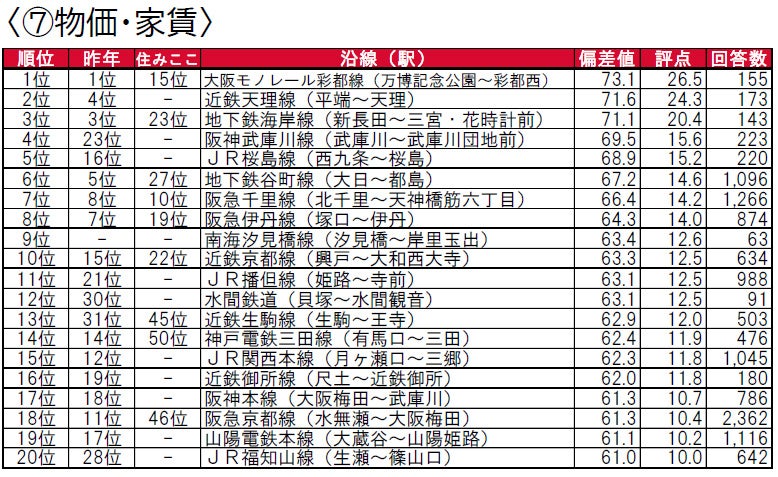 ●「物価・家賃」因子では、TOP10の新たな顔ぶれとして、4位に阪神武庫川線(昨年23位)、5位にJR桜島線(昨年16位)、9位に南海汐見橋線(昨年は回答者数50名未満のため順位なし)、10位に近鉄京都線(昨年15位)がランクインしています。