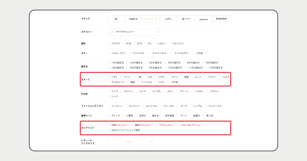 「モチーフ」や「コレクション」といった充実した項目で絞り込み検索ができるようになりました。これらの項目は複数選択が可能なため、より詳細な条件で商品を表示できます。この機能により、ユーザーが求める商品の特徴(ブランド/カテゴリー/素材など)から直感的に絞り込むことができるため、購買体験の向上に寄与しています。