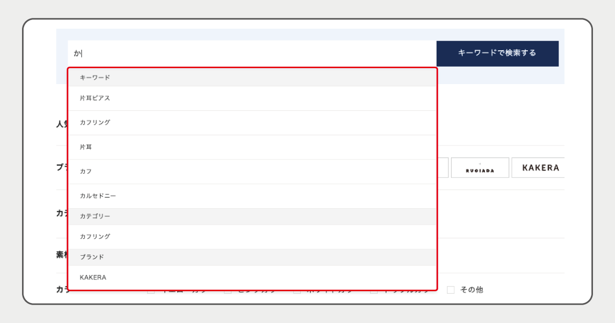 検索窓に入力中のテキストに基づく予測キーワード・カテゴリー・ブランドがサジェストとして表示されるようになりました。この機能により、すべてのテキストを入力する前に目的の項目を選択できるため、ユーザーの手間を省き利便性向上に貢献しています。