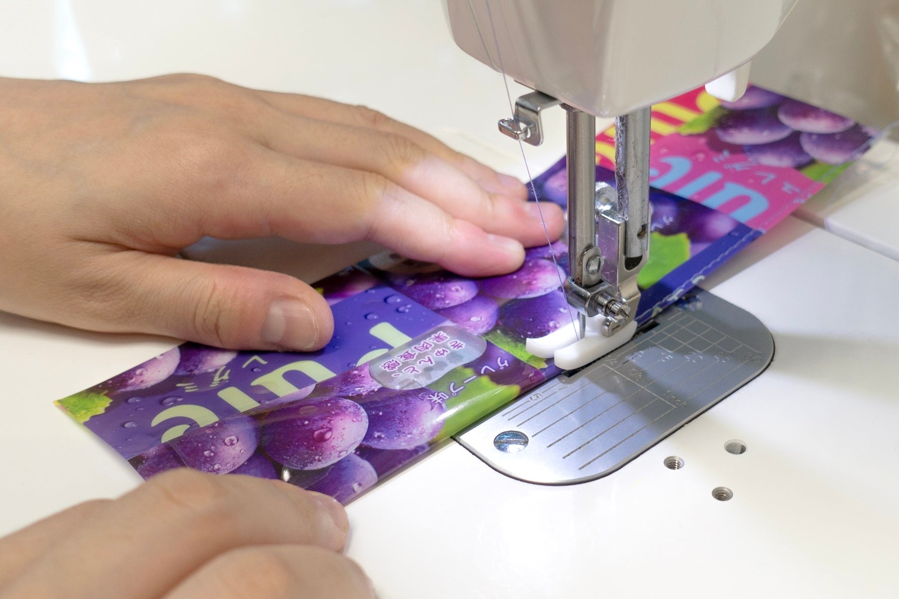 ペーパーパレードとの共創の中で、製造工程上どうしても生じてしまう廃棄包材を活用したバッグやペンケースを製作。商品のベース部分は職人が一つひとつ手作業で廃棄包材を切り取ってシート状にしたうえで丁寧に縫い上げており、バッグは裏生地を付けてシートに厚みを持たせ、ペンケースは逆にパッケージの透かしを活かすなど、アイテムによって質感が異なる点にもこだわりました。