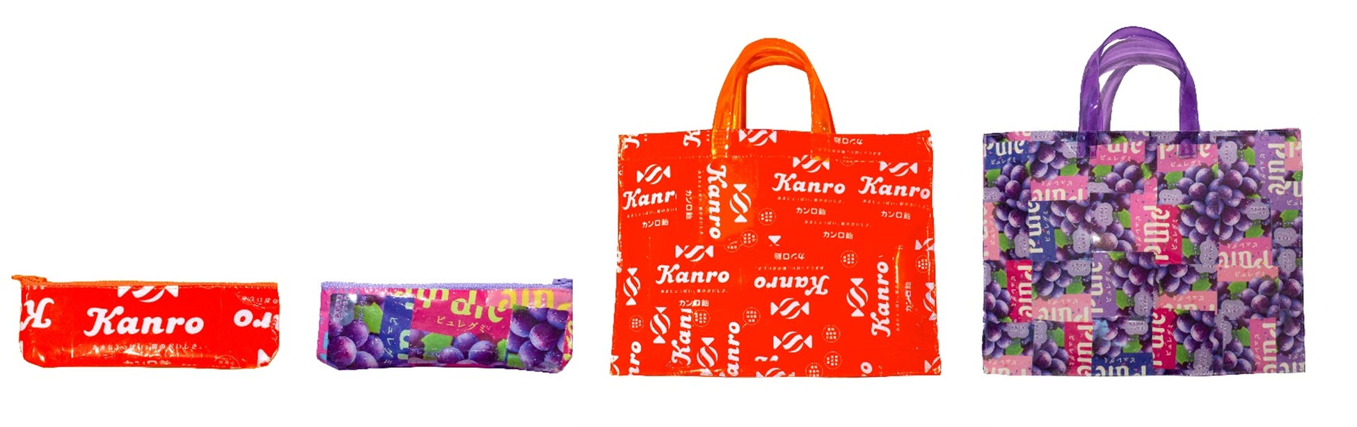お菓子のパッケージが、職人の手でカラフルなバッグやペンケースに!実物を展示販売 「ピュレグミ」や「カンロ飴」のパッケージから生まれたアップサイクル雑貨を、サステナブルイベントで販売