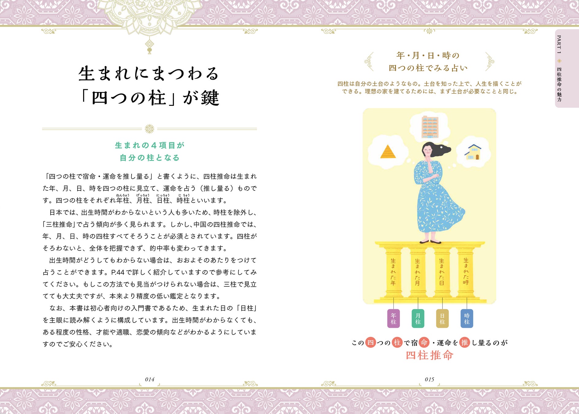 抜群の的中率ゆえ難解な四柱推命を、フルカラーのイラストや図版、さらにワーク形式などを取り入れ、迷わず、挫折せず習得できる入門書。