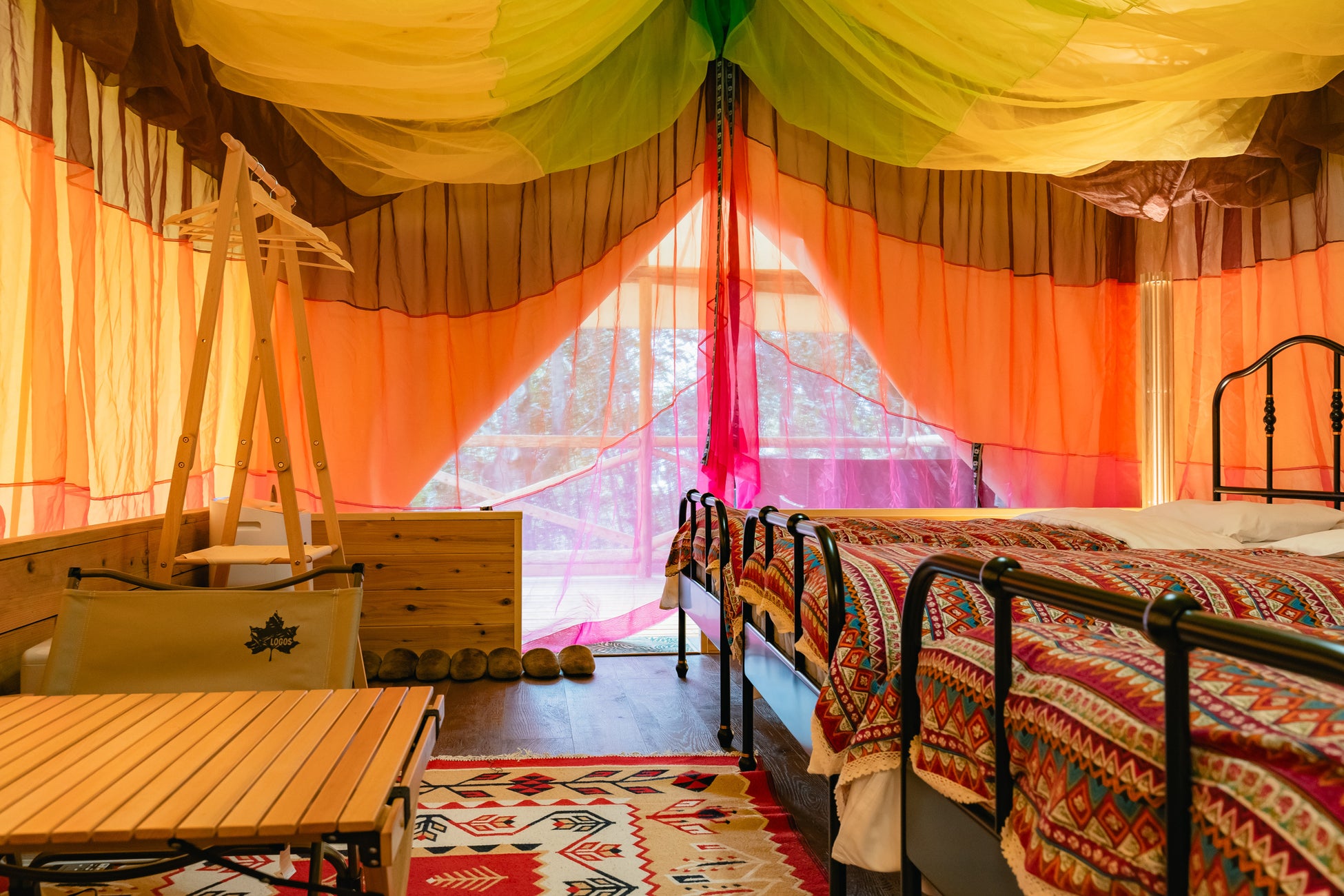 丸太で組まれたおしゃれなグランピングテントで宿泊!
