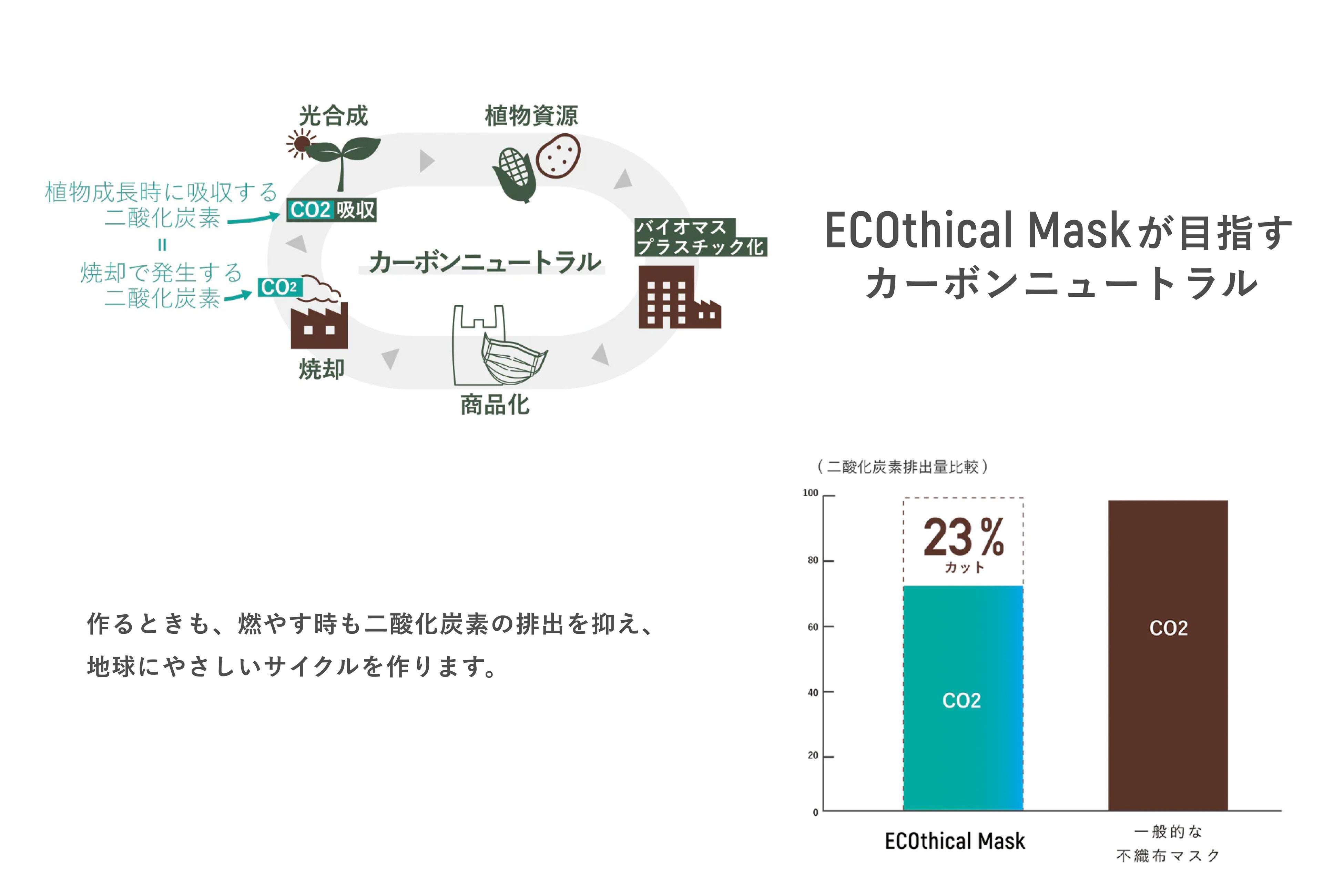 ECOthical Maskは、製造・焼却の観点で、一般的な不織布と比較し、CO2の排出を大幅にカットすることで2050年までのカーボンニュートラルの実現を目指します。
