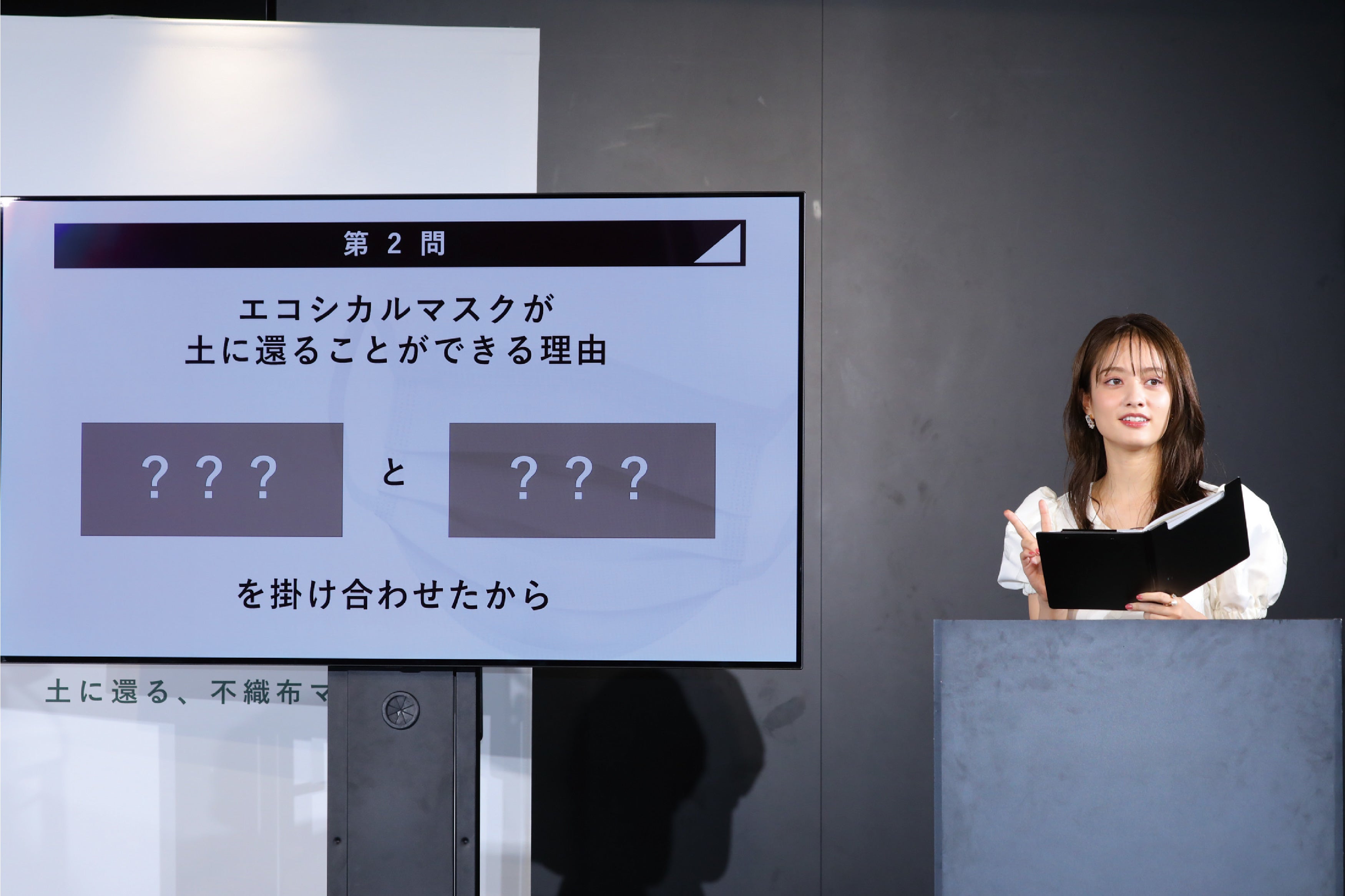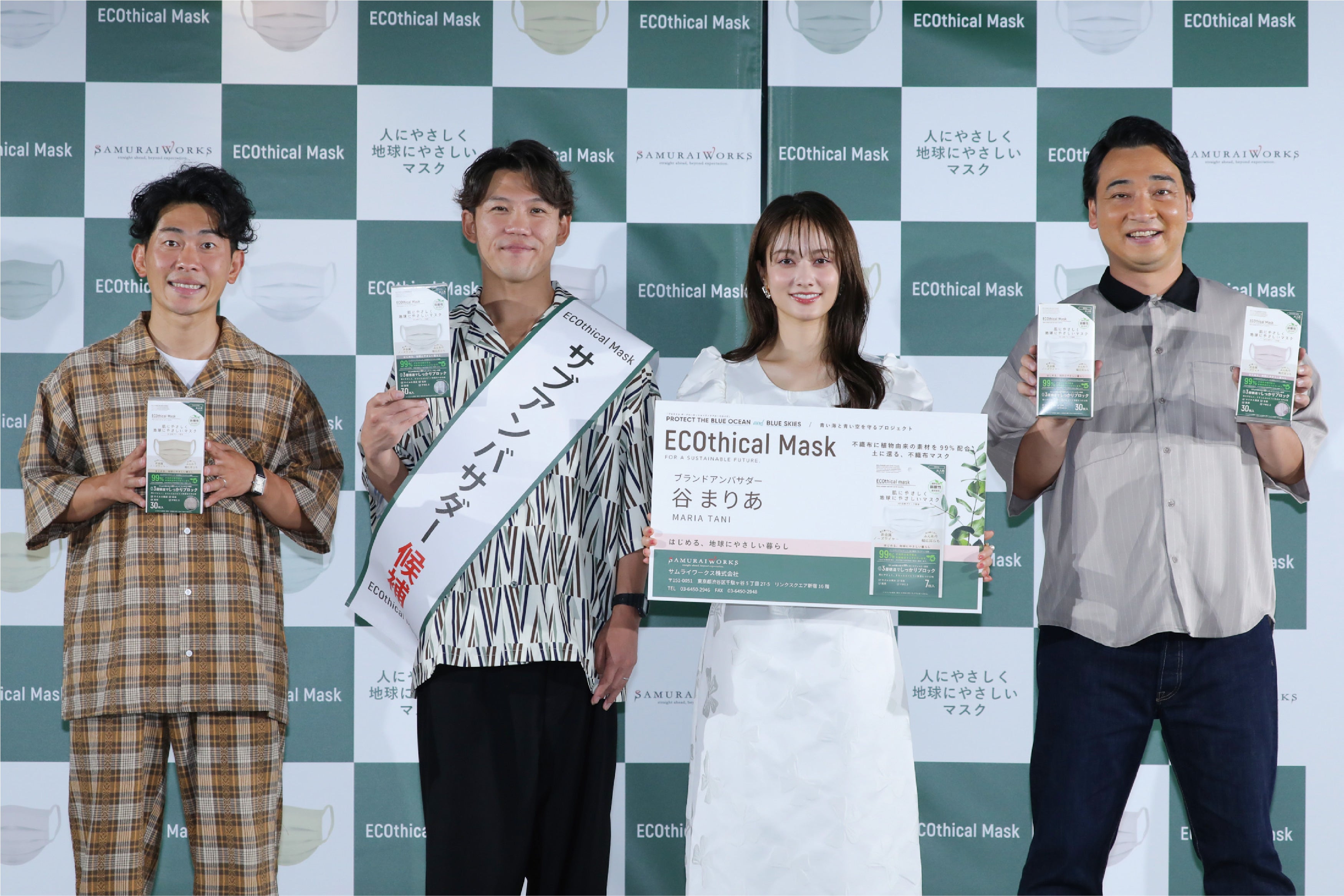 サムライワークス株式会社(代表取締役社長:新島 実 本社所在地:東京都渋谷区)は、谷まりあECOthical Maskブランドアンバサダー就任発表会を2022年8月17日(水)に開催しました。 人にやさしく、地球にやさしいマスク「ECOthical Mask(エコシカルマスク)」のブランドアンバサダーに就任した谷まりあさんと、ゲストとしてジャングルポケットの斉藤さん、太田さん、おたけさんの3名が登場。“サブブランドアンバサダー候補”を狙って、3本勝負を披露しました。